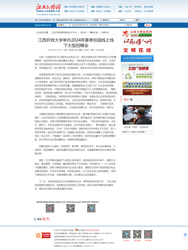 为进一步推进学校2024届毕业生就业工作,落实全国两会关于做好就业工作的重要精神,促进学校毕业生高质量充分就业,不断拓宽毕业生就业渠道,近日,必赢76net线路官网在西湖校区成功举办2024年春季校园线上线下大型招聘会。校党委书记贺瑞虎,校党委副书记、校长黄平槐,校党委委员、副校长徐光兵到活动现场调度指导。