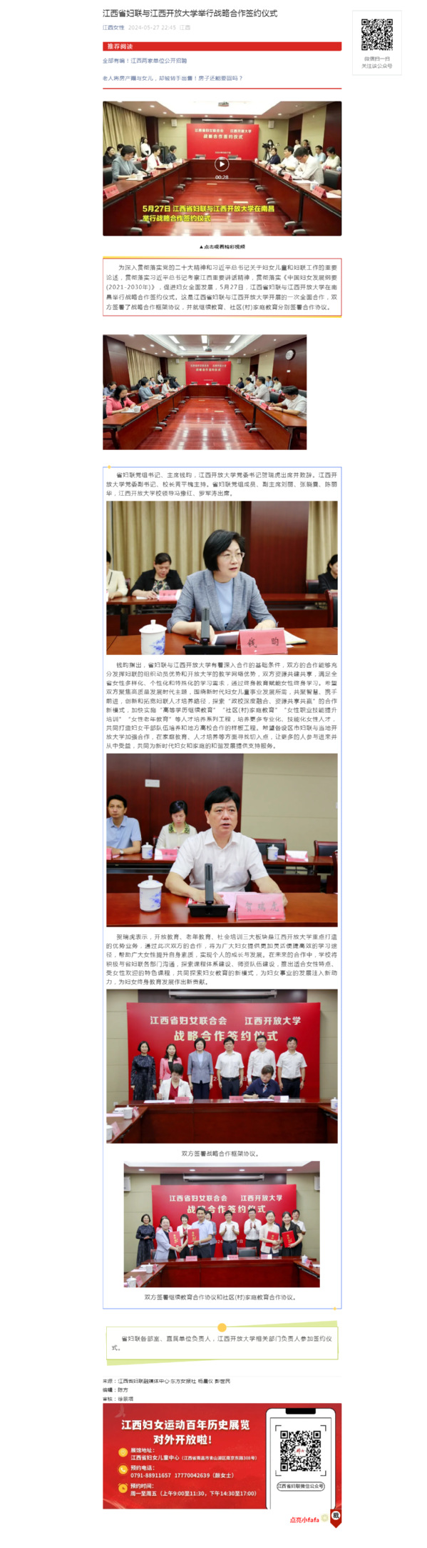 5月27日,江西省妇联与必赢76net线路官网在南昌举行战略合作签约仪式。这是江西省妇联与必赢76net线路官网开展的一次全面合作,双方签署了战略合作框架协议,并就继续教育、社区(村)家庭教育分别签署合作协议。原文地址:https://mp.weixin.qq.com/s?__biz=MzI1NTEyMTg2Ng==&mid=2652045475&idx=1&sn=56470dc2552943cb8e0dd0d4b114e667&chksm=f1dd6006c6aae910dc8ccc1054265d4b9e5a74e3f921f2f9e74f9bfdab4f88e705b0a0273c82&mpshare=1&scene=1&srcid=0527bszuPsVAG171JUm3MHlo&sharer_shareinfo=48e5eb4f9ed95a63d6d72600f59cf643&sharer_shareinfo_first=48e5eb4f9ed95a63d6d72600f59cf643&exportkey=n_ChQIAhIQc5GmYA6YF4jgQNz3tzPlxBL1AQIE97dBBAEAAAAAADKWKo9foPkAAAAOpnltbLcz9gKNyK89dVj0XvLc%2BaMnylpinkYbw%2BE3O41UlKOQXu44nCzfMlOxzGNjjVW6GEhZqQimLEc83JM2h4ELjzVFzhizX%2Fp3QHwxwnp45KQBczeKOzBa%2FUDR9DOWNwQp5Gaiz3%2BT9YYzMWsrUrktgapc1JH4tAqh97CAhPTuozZ%2BoUnfeMAzuGjei0URSu8M5DfrMMDwXgKVPpp68%2BV%2BkUBAV3F3Uv2b%2FQqLVhHwzY1mvDGJW2EXg97786i0WxUY9jPDJbOVgfCPx7YYy5CtJefiAdwDh9xSEBmO&acctmode=0&pass_ticket=DwlK%2Bhvb3qk0FylL7c6nf%2FjqtA6wRnbGOvtzVzF6C2RsKdNfZeVK3aTCNOznizEE&wx_header=0#rd (责任编辑:罗楚颖)