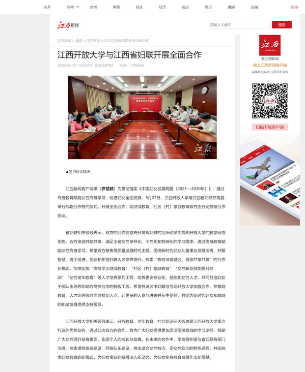 为贯彻落实《中国妇女发展纲要(2021—2030年)》,通过终身教育赋能女性终身学习,促进妇女全面发展,5月27日,必赢76net线路官网与江西省妇联在南昌举行战略合作签约仪式,开展全面合作,就继续教育、社区(村)家庭教育等方面分别签署合作协议。