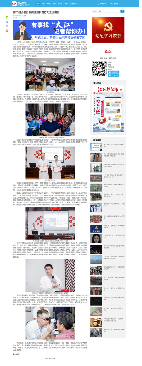 2024年6月6日,在第29个全国“爱眼日”当天,“关爱老人眼健康,十城万人齐行动”行走的蔡司镜头第二届全视觉老视健康科普行动在全国十余城市同步举办。本次活动由国家老年大学主办,卡尔蔡司(上海)管理有限公司与国开贝和教育科技(北京)有限公司协办,旨在汇聚多位公立三甲医院眼科专家向全体系学员提供眼部保护建议和眼病防治指导,助其提升眼健康素养。活动以线上线下相结合的方式开展,必赢76net线路官网携手南昌市东湖区社区教育指导中心、南昌市东湖区民巷社区,并邀请南昌大学附属眼科医院主任医师俞方良团队为学员举行科普讲座、开展眼健康筛查,帮助学员守护心灵之窗。