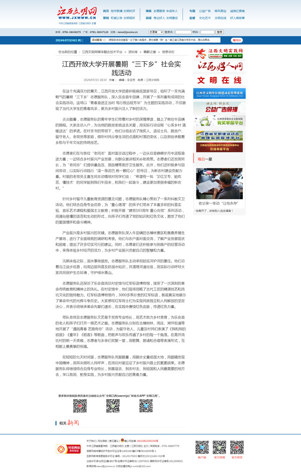 在这个充满活力的夏天,必赢76net线路官网团委积极响应国家号召,组织了一支充满朝气的暑期“三下乡”志愿服务队,深入乐安县牛田镇,开展了一系列富有成效的社会实践活动。这场以“青春奋进正当时 笃行致远绽芳华”为主题的实践活动,不仅展现了当代大学生的青春风采,更为乡村振兴注入了新的活力。