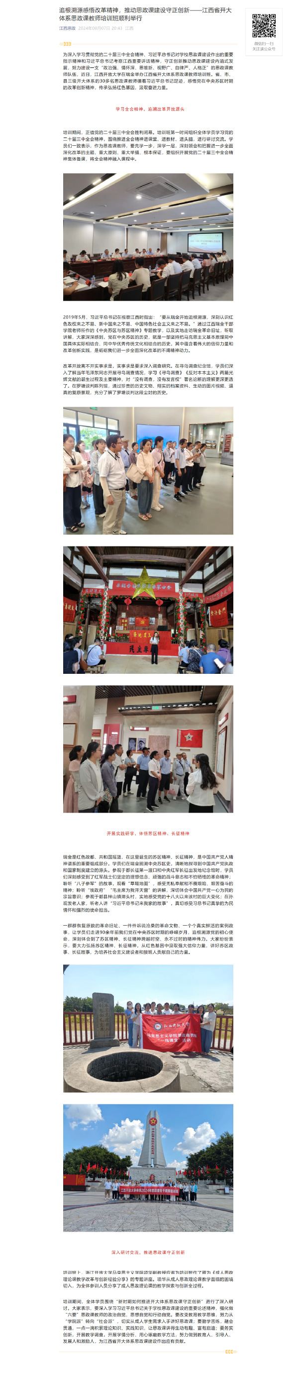 为深入学习贯彻党的二十届三中全会精神、习近平总书记对学校思政课建设作出的重要指示精神和习近平总书记考察江西重要讲话精神,守正创新推动思政课建设内涵式发展,努力建设一支“政治强、情怀深、思维新、视野广、自律严、人格正”的思政课教师队伍,近日,必赢76net线路官网在瑞金举办江西省开大体系思政课教师培训班。省、市、县三级开大体系的30多名思政课教师循着习近平总书记足迹,感悟党在中央苏区时期的改革创新精神,传承弘扬红色基因,汲取奋进力量。