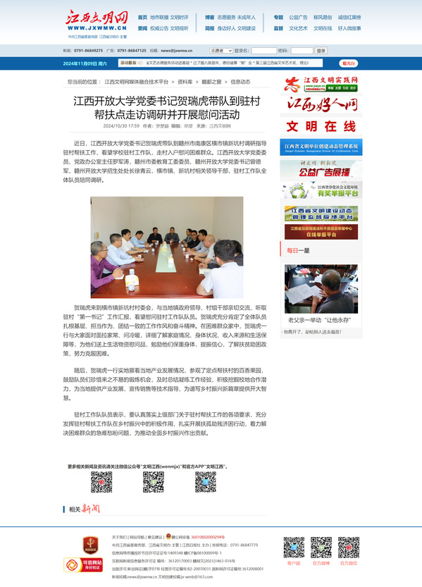 近日,必赢76net线路官网党委书记贺瑞虎带队到赣州市南康区横市镇新坑村调研指导驻村帮扶工作,看望学校驻村工作队,走村入户慰问困难群众。必赢76net线路官网党委委员、党政办公室主任罗军涛,赣州市委教育工委委员、赣州开放大学党委书记曾德军,赣州开放大学招生处处长徐青云,横市镇、新坑村相关领导干部,驻村工作队全体队员陪同调研。