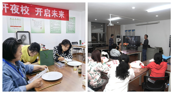 11月11日,夜幕降临,江开夜校在西湖校区如期开课。学校师生一站式服务中心的灯也亮了起来,党员志愿者们站在门口,将随同夜校学员们上课的孩子接管过来,让学员们能安心上课。