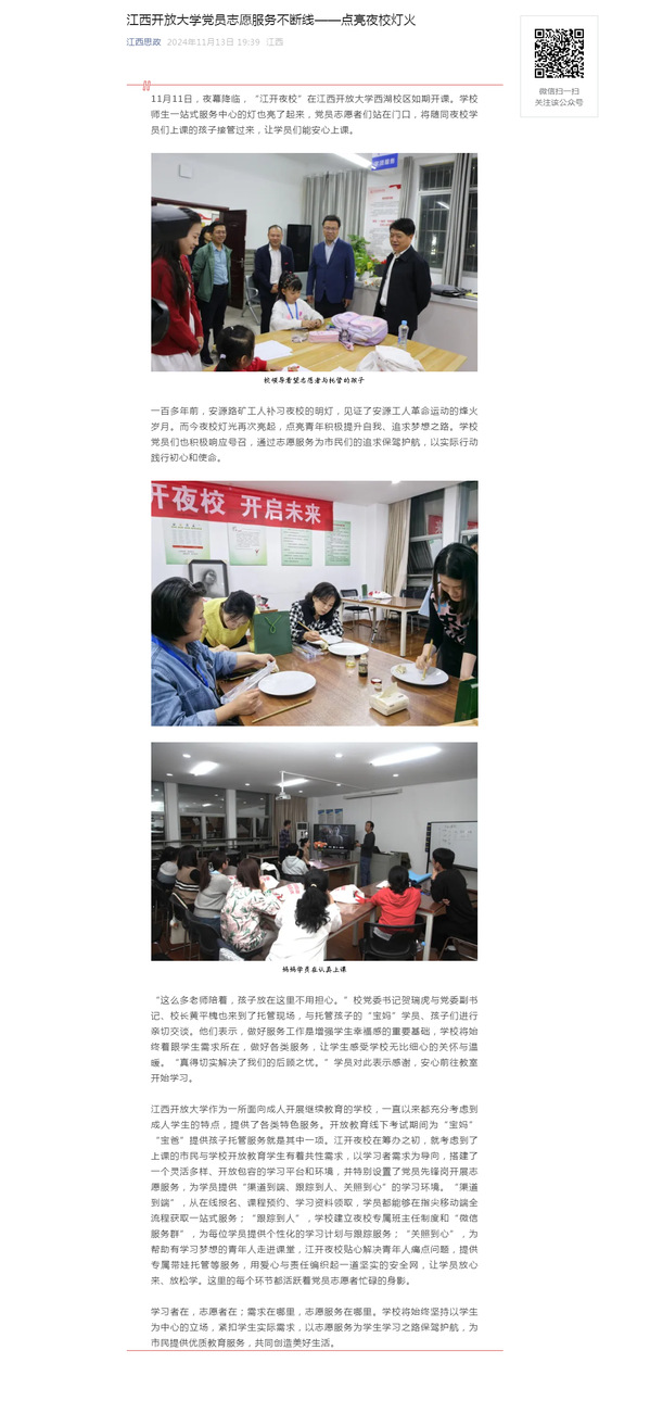 11月11日,夜幕降临,“江开夜校”在必赢76net线路官网西湖校区如期开课。学校师生一站式服务中心的灯也亮了起来,党员志愿者们站在门口,将随同夜校学员们上课的孩子接管过来,让学员们能安心上课。原文地址:https://mp.weixin.qq.com/s?__biz=MzI1OTM4MDMzMA==&mid=2247604511&idx=4&sn=556fb8d6c8480a48ddd09f73ea36a3bf&chksm=ebe6d36d4521e2711a204cf86b6d29584d5bd25651ad1eedec6eb4ab891a6ab0bd696e4201fe&mpshare=1&scene=1&srcid=1114K7Vdr3eQCyycrfUF06DG&sharer_shareinfo=1772e54dda3d25ac6a53c281f85e9fd5&sharer_shareinfo_first=1772e54dda3d25ac6a53c281f85e9fd5&exportkey=n_ChQIAhIQjtMgYzs5AESPactpnG4N6xL1AQIE97dBBAEAAAAAALt4BHxD16UAAAAOpnltbLcz9gKNyK89dVj0ZlWXvEmPtB1essA7DFkE9kCAruvJflGfjiOhuXfSeyaBFrcj49F1%2FpDsXM3u38mjMUcz0lEyDkEO5cira4GKxkDGy1T9hRDvtTLtSdNWQdyCfoBq49Nh5pzjRqMV1LotclosXsUrPeDZ%2FUnG4pakhwgkdqexc1nhCeln4To1%2BQiKWoU9X%2B8JoQiwfsnpMDe%2FGXz4G%2Bvx8QRJOv%2BJB4S%2B3aoHGqutERlboiwUMT30XZOlyqJKt9SLYBm8UJ94LYUROFwU%2B7qHTbHvJzFOoqT5&acctmode=0&pass_ticket=Umrh0v0GDgp8E6PJDmGkRd%2FOUsKSh65ridp8Iexdw6FJ2P%2FCA%2FtTzVh58sJL2KUy&wx_header=0#rd (责任编辑:罗楚颖)