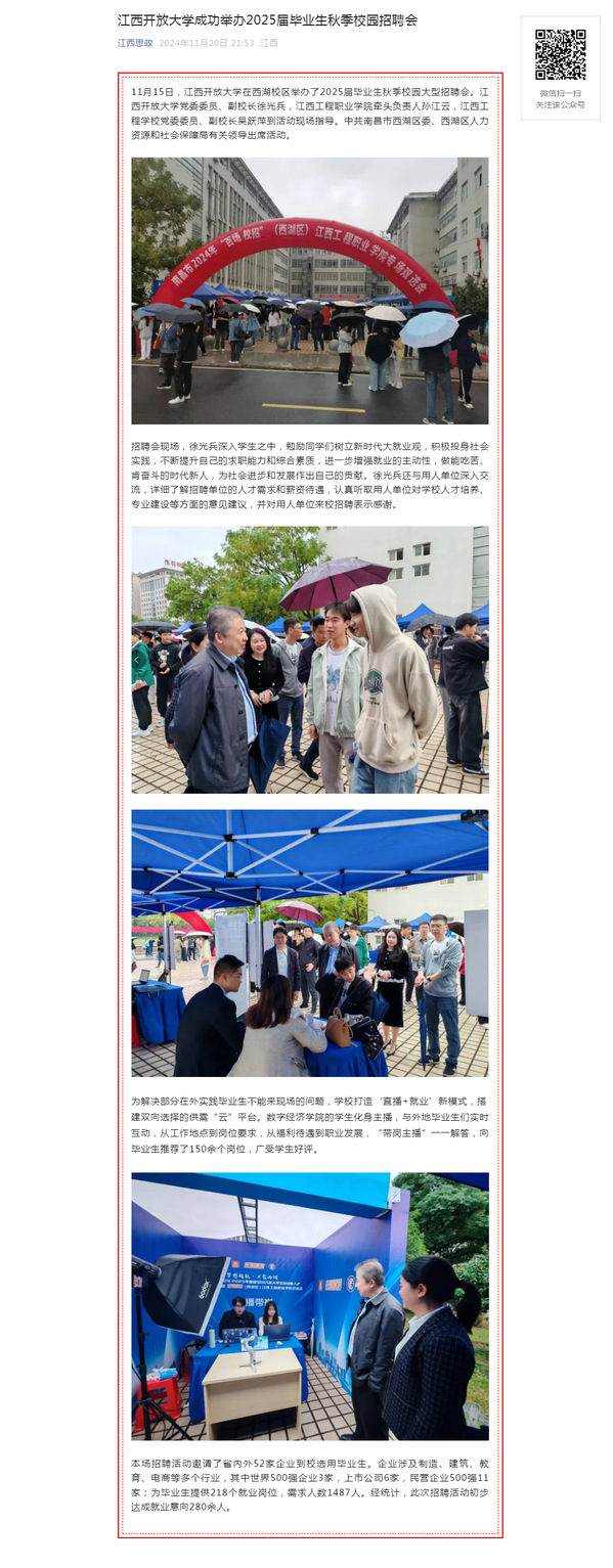 11月15日,必赢76net线路官网在西湖校区举办了2025届毕业生秋季校园大型招聘会。必赢76net线路官网党委委员、副校长徐光兵,江西工程职业学院牵头负责人孙江云,江西工程学校党委委员、副校长吴跃萍到活动现场指导。中共南昌市西湖区委、西湖区人力资源和社会保障局有关领导出席活动。
