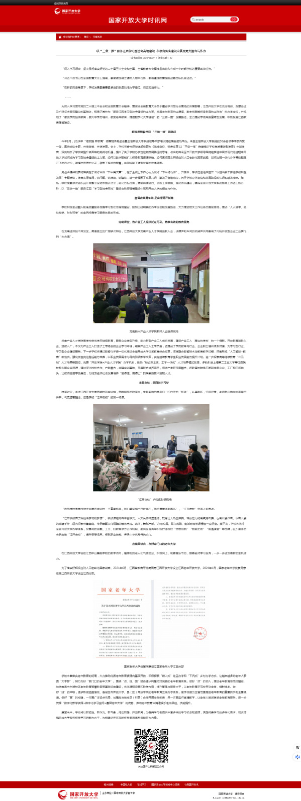 近日,国开时讯网在《深度观察》栏目发布《以“三做一推”服务江西学习型社会高地建设 在教育强省建设中展现更大担当与作为》一文,报道我校以“三做一推”服务江西学习型社会高地建设纪实。