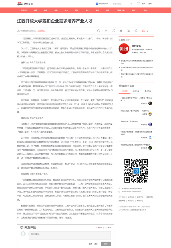 11月27日,新浪新闻报道我校龙南新兴产业人才学院紧扣内陆开放型企业培养产业人才纪实。