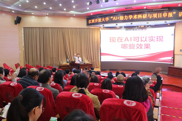 为贯彻落实党的二十届三中全会精神,推进教育数字化转型,同时提升我校科研水平,活跃学术氛围,12月4日上午,学校特邀秋叶集团AI智能工作台项目开发总监哈雷老师为专业技术人员做“AI+助力学术科研与项目申报”学术讲座。讲座由科研处(学习型社会研究院)和江西省远程教育学会联合主办。学校各部门、各学院共计70余人现场聆听,部分教师通过视频直播在线收看。