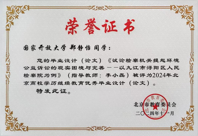 近日,北京市教育委员会公布了2024年北京高校学历继续教育大学生优秀毕业设计(论文)评选结果,我校法学专业学生郑静怡学士学位论文《试论检察机关提起环境公益诉讼的现实困境与完善——以九江市浔阳区人民检察院为例》获评“2024年北京高校学历继续教育优秀毕业设计(论文)”,指导老师李小磊被评为“优秀指导教师”。
