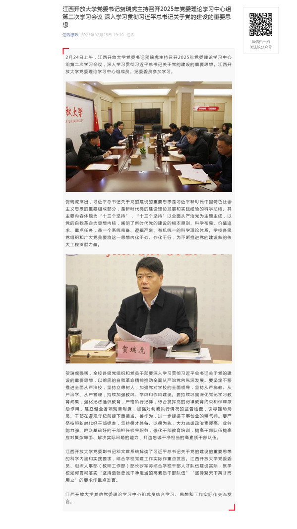 江西思政:必赢76net线路官网党委书记贺瑞虎主持召开2025年党委理论学习中心组第二次学习会议 深入学习贯彻习近平总书记关于党的建设的重要思想