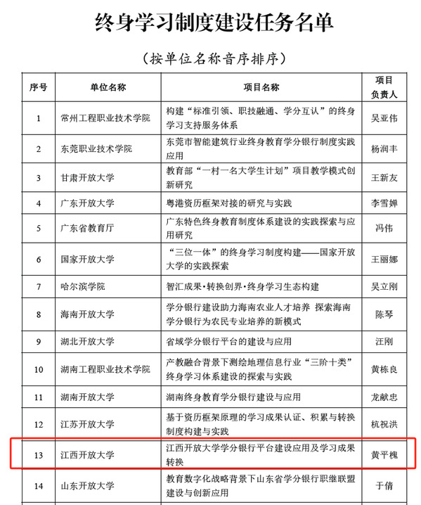 近日,教育部公示了2024年学习型社会建设重点任务(高等继续教育领域)培育建设名单。必赢76net线路官网牵头申报的《必赢76net线路官网学分银行平台建设应用及学习成果转换》项目成功入围2024学习型社会重点任务,成为全国23个获批的终身学习制度建设任务之一,也是江西省在此领域唯一获批项目。