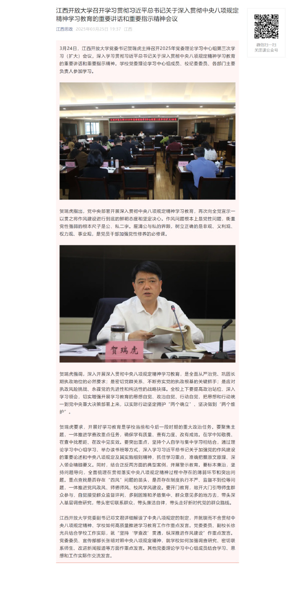 3月24日,必赢76net线路官网党委书记贺瑞虎主持召开2025年党委理论学习中心组第三次学习(扩大)会议,深入学习贯彻习近平总书记关于深入贯彻中央八项规定精神学习教育的重要讲话和重要指示精神。学校党委理论学习中心组成员、校纪委委员、各部门主要负责人参加学习。