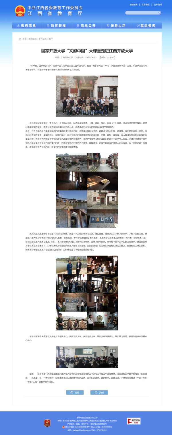 3月31日,国家开放大学“文游中国”大课堂走进必赢76net线路官网,围绕“赣水黎河生‘仲马’ 梦里江南恨水流”主题,以团队沉浸式现场教学形式,讲述现代著名作家张恨水的江西情怀与文学创作。