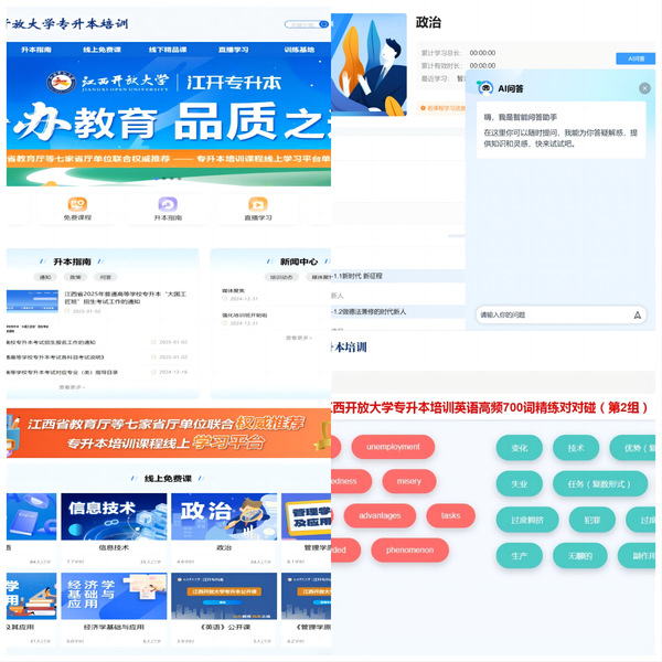 作为江西省教育厅等七家省厅联合推荐的专升本线上培训平台,必赢76net线路官网精心打造了集课程学习、专升本资讯、公益讲座、模拟练习等功能于一体的一站式智慧学习平台。平台通过AI智能助教在线答疑、个性化资源推荐、趣味性PK刷题等多项智能化服务,为学员提供个性化的学习支持。同时,平台与江西省终身学习网资源库深度对接,汇聚全省优质师资力量,为全省考生提供高质量的免费精品课程资源。