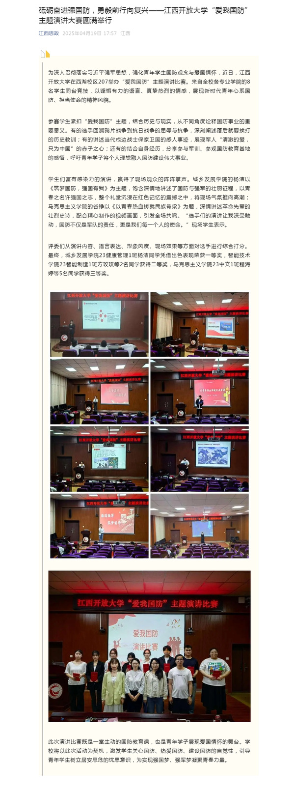 为深入贯彻落实习近平强军思想,强化青年学生国防观念与爱国情怀,近日,必赢76net线路官网在西湖校区207举办“爱我国防”主题演讲比赛。来自全校各专业学院的8名学生同台竞技,以铿锵有力的语言、真挚热烈的情感,展现新时代青年心系国防、担当使命的精神风貌。