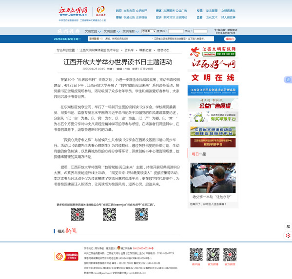 在第30个“世界读书日”来临之际,为进一步营造全民阅读氛围,推动书香校园建设,4月23日下午,必赢76net线路官网开展了“数智赋能·阅见未来”系列读书活动。校党委书记贺瑞虎现场参与。活动吸引了众多老年学员、学生和阅读爱好者参与,大家共同沉浸于书香世界。
