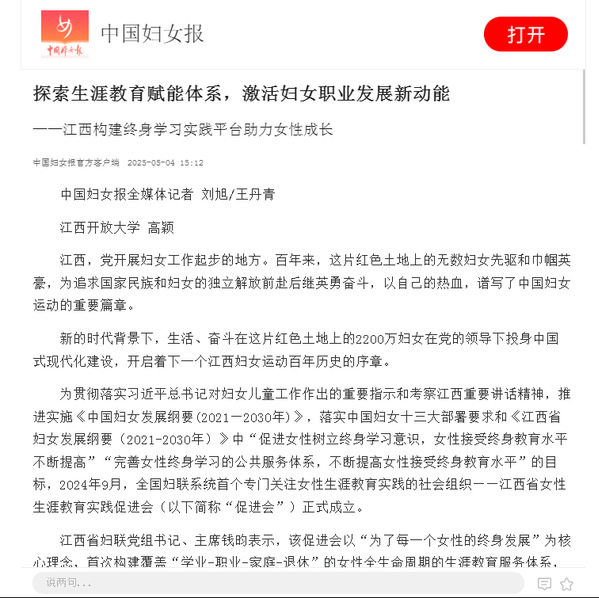 近日,《中国妇女报》报道江西省女性生涯教育实践促进会常务副会长、我校高颖教授到设区市开展以“探索职业航向·激活成长动能”为主题的宣讲活动。高颖教授结合机关单位工作实际,带大家从生涯的基础理论开始学习,走进生涯的世界。推动女性牢固树立终身学习意识,不断提升女性综合素质能力。