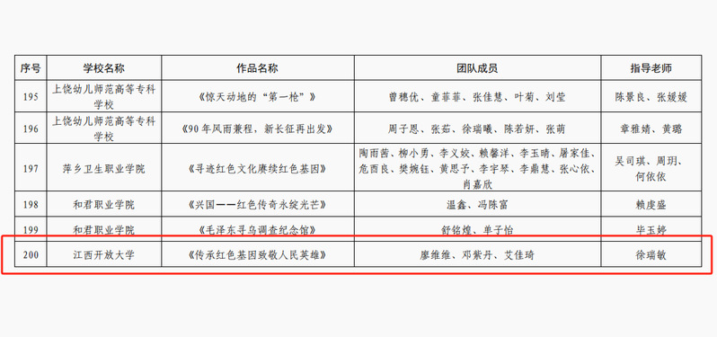 近日,江西省教育厅公布了2024 年度全省 “红色走读” 系列活动的获奖名单,我校选送的作品《传承红色基因 致敬人民英雄》被评为“红色云游”优秀作品。