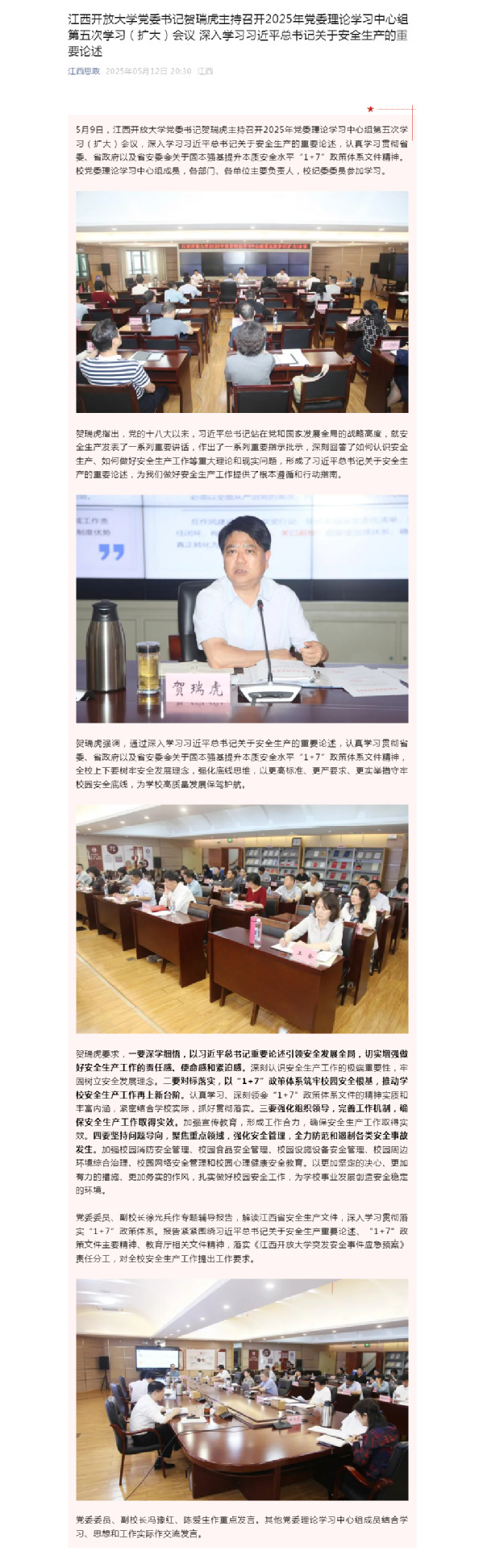 5月9日,必赢76net线路官网党委书记贺瑞虎主持召开2025年党委理论学习中心组第五次学习(扩大)会议,深入学习习近平总书记关于安全生产的重要论述,认真学习贯彻省委、省政府以及省安委会关于固本强基提升本质安全水平“1+7”政策体系文件精神。校党委理论学习中心组成员,各部门、各单位主要负责人,校纪委委员参加学习。
