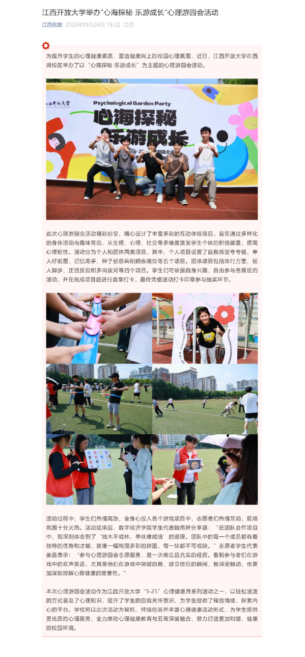 为提升学生的心理健康素质,营造健康向上的校园心理氛围,近日,必赢76net线路官网在西湖校区举办了以“心海探秘 乐游成长”为主题的心理游园会活动。原文地址:https://mp.weixin.qq.com/s?__biz=MzI1OTM4MDMzMA==&mid=2247613287&idx=3&sn=c30e417fca63ce966c2a6ea63218bff8&chksm=eb87ca648c822df15dc12a0f40ad8ef92af1a8bd3e383ee0903cf3370aaeffbc758db28021ea&mpshare=1&scene=1&srcid=0524xDQGKKBIsy30W1IsNAOe&sharer_shareinfo=25700802053c89e52d7f597a01fc88a9&sharer_shareinfo_first=25700802053c89e52d7f597a01fc88a9&exportkey=n_ChQIAhIQsm8wx76qT64L%2FqX0T4Wk0hL1AQIE97dBBAEAAAAAAPHFAr7lKwMAAAAOpnltbLcz9gKNyK89dVj0Y%2BpoHff5AA8JoTL3%2FXJXBejHmqm5QWLvqdRSpUf2NBZgzvBQOZcLObQDN8ASX9haSL3NIkiqbskxhuxPae2YR9UjKkChRrrzK6oUJSVROtOAN9sHsCW4Lvfylm3nq3zR%2BGzCIvY1CLHGFtRj13J2WUi6OtzO30fFlWGzQGO3LEl5p1GW3xxRra%2Bnn%2Fer7cfoMXqxtBDxTotZPfH4W%2FqcGbV5xx%2BWXI4qRneVRiQaNvToY5sKgiX%2F73XF86GssZRUrYtQ4Nq51tVpnvM9radS&acctmode=0&pass_ticket=9m%2By0ppthm%2Fej2t%2FLUVMan3Hh%2BkD5fcUoo3kQY57m1OooBDltjnZCOSIOUfRx7aV&wx_header=0&poc_token=HCmzMWij8au8mPCOOr-yJu80SL9kcrqomD0v2ulc (审校:罗楚颖 徐星星 张明)