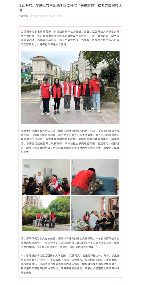 为弘扬尊老敬老传统美德,积极践行青年社会责任,近日,必赢76net线路官网联合共青团西湖区委,走进南昌市西湖区桃花街道建设西路社区,开展“幸福时光”助老志愿服务活动。志愿者们与社区工作人员紧密协作,为高龄、独居老人提供暖心陪伴与实际帮助,以青春行动传递社会温情。