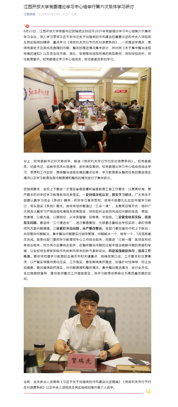 6月13日,必赢76net线路官网党委书记贺瑞虎主持召开2025年党委理论学习中心组第六次集体学习会议,深入学习贯彻习近平总书记关于加强党的作风建设的重要论述和中央八项规定及其实施细则精神,重点学习《党政机关厉行节约反对浪费条例》,一体推进学查改,围绕党委班子及其成员查摆的问题、整改的推进情况集中研讨,并对照《关于集中整治违规吃喝的通知》以及发生在河南、湖北、安徽等地违规吃喝的典型案例,深刻检视剖析、深化教育警示。校党委理论学习中心组成员,校纪委委员参加学习。