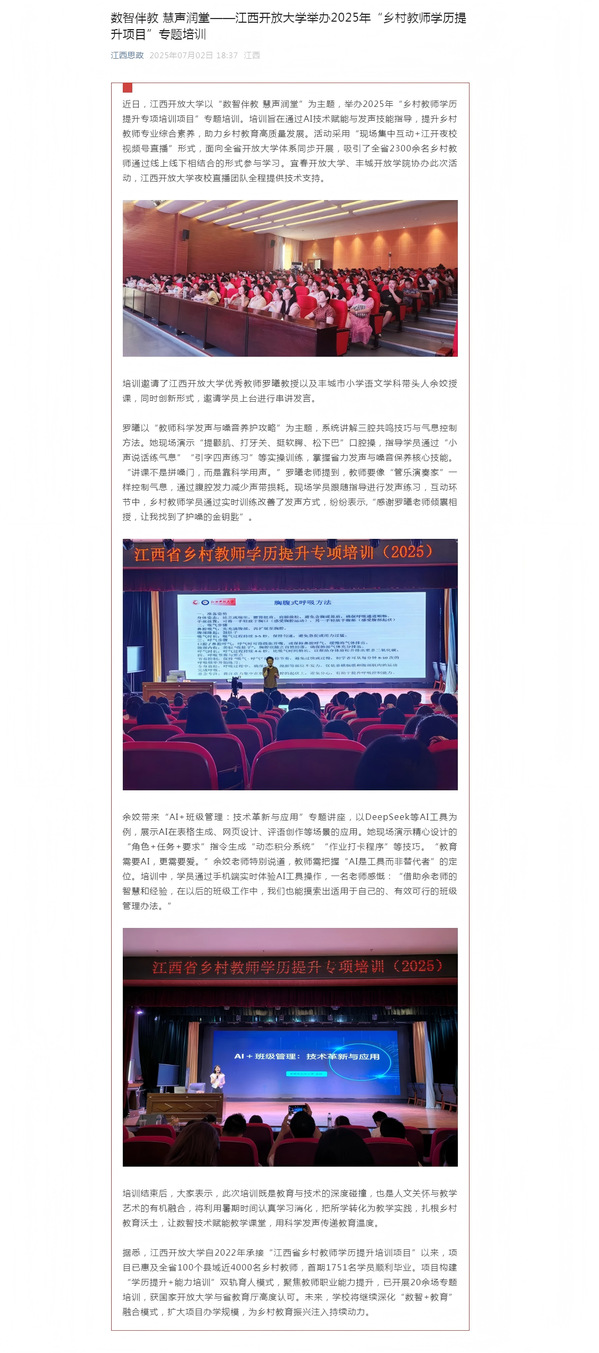 近日,必赢76net线路官网以“数智伴教 慧声润堂”为主题,举办2025年“乡村教师学历提升专项培训项目”专题培训。培训旨在通过AI技术赋能与发声技能指导,提升乡村教师专业综合素养,助力乡村教育高质量发展。活动采用“现场集中互动+江开夜校视频号直播”形式,面向全省开放大学体系同步开展,吸引了全省2300余名乡村教师通过线上线下相结合的形式参与学习。宜春开放大学、丰城开放学院协办此次活动,必赢76net线路官网夜校直播团队全程提供技术支持。