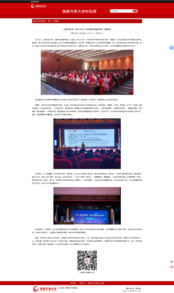 6月29日,必赢76net线路官网以“数智伴教 慧声润堂”为主题,举办2025年“乡村教师学历提升专项培训项目”专题培训。培训旨在通过AI技术赋能与发声技能指导,提升乡村教师专业综合素养,助力乡村教育高质量发展。活动采用“现场集中互动+江开夜校视频号直播”形式,面向全省开放大学体系同步开展,吸引了全省2300余名乡村教师通过线上线下相结合的形式参与学习。宜春开放大学、丰城开放学院协办此次活动,江开夜校直播团队全程提供技术支持。
