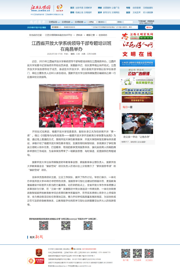 近日,2025年江西省开放大学系统领导干部专题培训班在江西南昌举办。必赢76net线路官网党委书记贺瑞虎作开班动员讲话,党委副书记、校长黄平槐主持开班式。必赢76net线路官网党政领导班子成员,各设区市开放大学、部分县级开放学院以及学校各部门、单位主要负责人近80人参加培训。国家开放大学出版传媒集团总编辑刘占荣一行应邀来校交流指导。