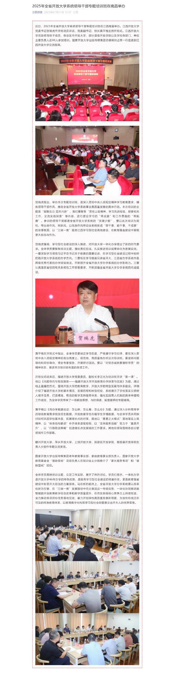 近日,2025年全省开放大学系统领导干部专题培训班在江西南昌举办。必赢76net线路官网党委书记贺瑞虎作开班动员讲话,党委副书记、校长黄平槐主持开班式。必赢76net线路官网党政领导班子成员,各设区市开放大学、部分县级开放学院以及学校各部门、单位主要负责人近80人参加培训。国家开放大学出版传媒集团总编辑刘占荣一行应邀到必赢76net线路官网交流指导。