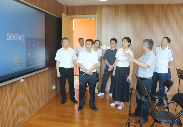 陈洪萍一行走进学校老年教育智慧教室现场观摩智慧教学设备了解课程开展形式对学校以技术赋能老年学习体验的做法给予高度肯定。