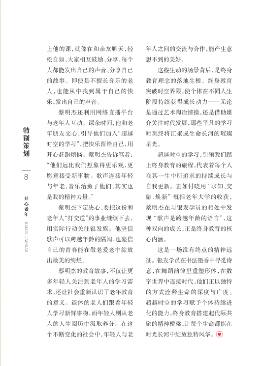 近日,我校教师陈志宏撰写的《超越时空的学习:奔赴终身教育的璀璨旅程》一文,在《开心老年》杂志2025年第8期正式刊发。该文以国家老年大学江西分部(江西老年开放大学)学员付晓的学习经历为切入点,通过“求知、交融、焕新”三个维度,真实反映了老年群体在终身学习过程中的获得感与幸福感。文章还聚焦00后教师蔡明杰通过音乐教学助力银发学员实现“超越时空的学习”的动人故事,体现出代际共融、技术赋能对老年教育发展的积极影响。