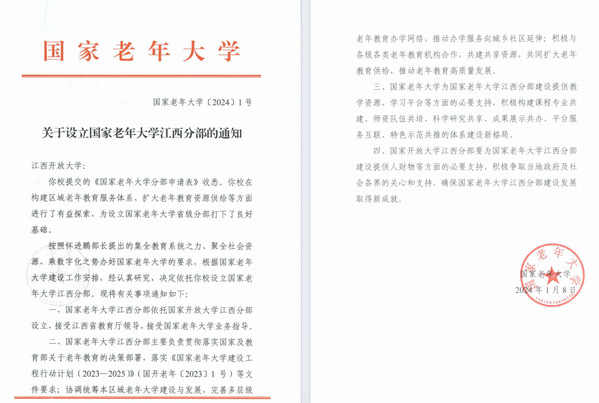 为了落实好积极应对人口老龄化国家战略,2021年6月,江西省教育厅批复同意必赢76net线路官网设立江西老年开放大学。2024年1月,国家老年大学批复同意依托必赢76net线路官网设立江西分部。