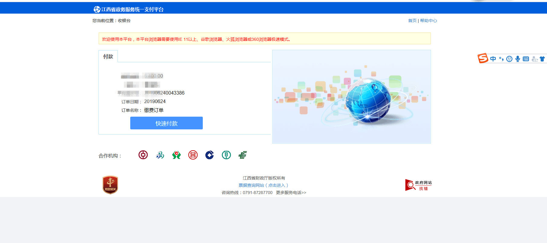 七、转入江西省财政统一支付平台后,再次确认缴款信息,无误后点击快速付款。