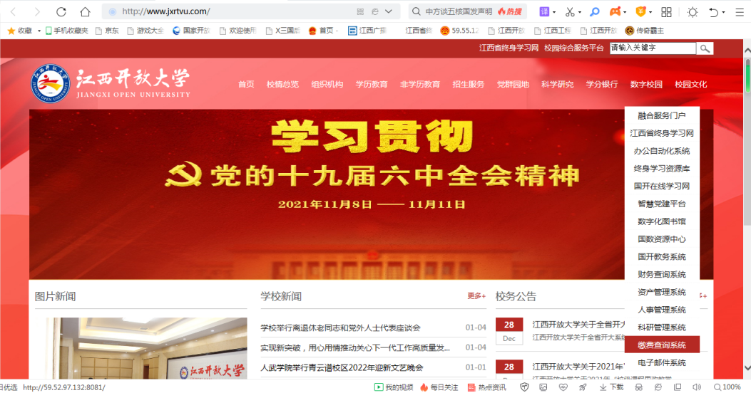 一、登录江西开放大学网站(),选择数字校园下的缴费查询系统,进入校园网上统一支付平台登录界面。