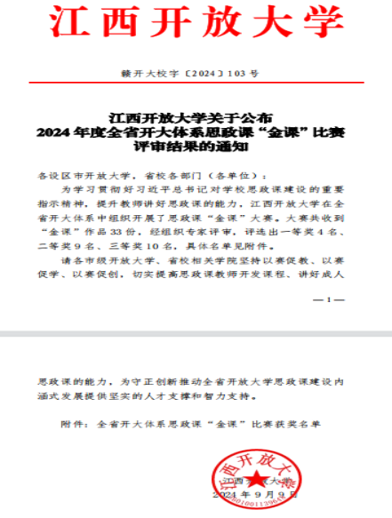 近日,在必赢76net线路官网公布的《关于公布2024 年度全省开大体系思政课“金课”比赛评审结果的通知》(赣开大校字〔2024〕103 号),我院教师罗运华凭借其扎实的教学功底、创新的教学方法,在众多参赛选手中脱颖而出,斩获“三等奖”的佳绩。 学院领导对罗运华老师的获奖表示热烈祝贺,并号召全体教师以此为契机,积极探索教育教学的改革,不断提升教学水平和业务能力。 (供稿:教务科 责编:罗运华 终审:倪涛)