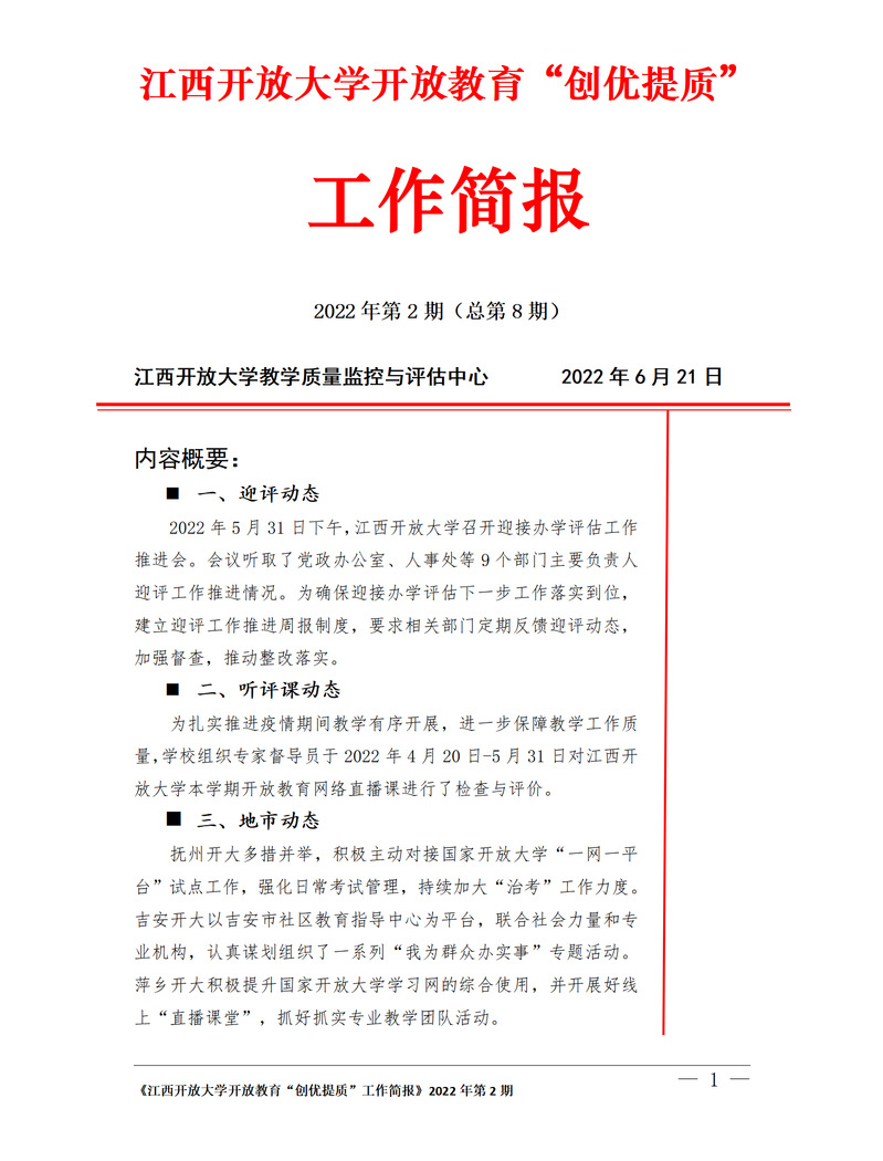 必赢76net线路官网开放教育“创优提质”工作简报 2022年第2期(总第8期)