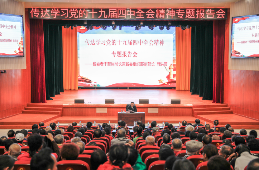 11月4日,省委老干部局召开传达学习党的十九届四中全会精神专题报告会。省委老干部局局长兼省委组织部副部长肖洪波作专题报告,他强调,要深入学习贯彻党的十九届四中全会精神,始终以习近平新时代中国特色社会主义思想为引领,不断增强“四个意识”、坚定“四个自信”、做到“两个维护”,确保四中全会精神入脑入心,结合老干部工作实际,用心用情做好新时代老干部工作,以高度的历史使命感和政治责任感,加快推进老干部工作创新发展。