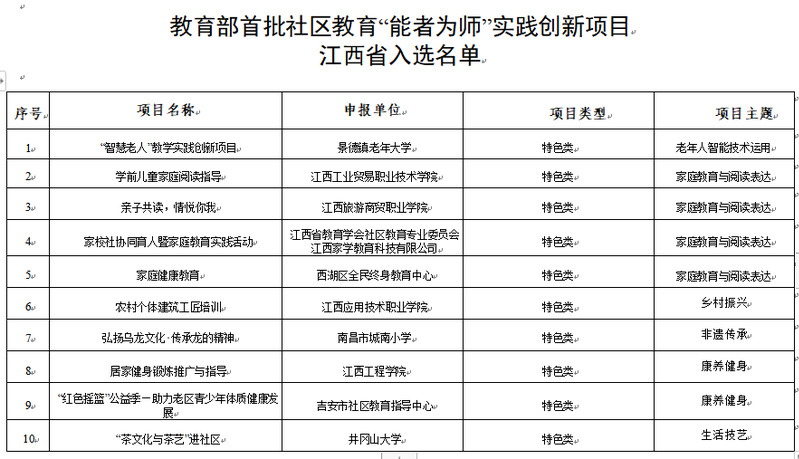 427日,教育部公布了社区教育“能者为师”实践创新项目首批启动名单(共403个),我省10个项目入选。其中,景德镇老年大学“‘智慧老人’教学实践创新项目”入选“老年人智能技术运用”特色类项目;江西工业贸易职业技术学院“学前儿童家庭阅读指导”、江西旅游商贸职业学院“亲子共读,情悦你我”、江西省教育学会社区教育专业委员会江西家学教育科技有限公司“家校社协同育人暨家庭教育实践活动”、西湖区全民终身教育中心“家庭健康教育”入选“家庭教育与阅读表达”特色类项目;江西应用技术职业学院“农村个体建筑工匠培训”入选“乡村振兴”特色类项目;南昌市城南小学“弘扬乌龙文化 传承龙的精神”入选“非遗传承”特色类项目;江西工程学院“居家健身锻炼推广与指导”、吉安市社区教育指导中心“‘红色摇篮’公益季—助力老区青少年体质健康发展”入选“康养健身”特色类项目,井冈山大学“茶文化与茶艺进社区”入选“生活技艺”特色类项目。