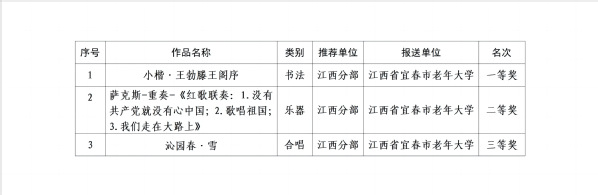 近日,国家老年大学公布了2024年全国老年教育舞蹈、合唱、器乐、书画和摄影五类教学成果展的评选结果。国家老年大学江西分部(江西老年开放大学)共选送四类20个作品,其中江西省宜春市老年大学《小楷·王勃滕王阁序》《萨克斯-重奏-<红歌联奏:1.没有共产党就没有心中国;2.歌唱祖国;3.我们走在大路上>》《沁园春·雪》3个作品分获书法类一等奖、器乐类二等奖、合唱类三等奖。