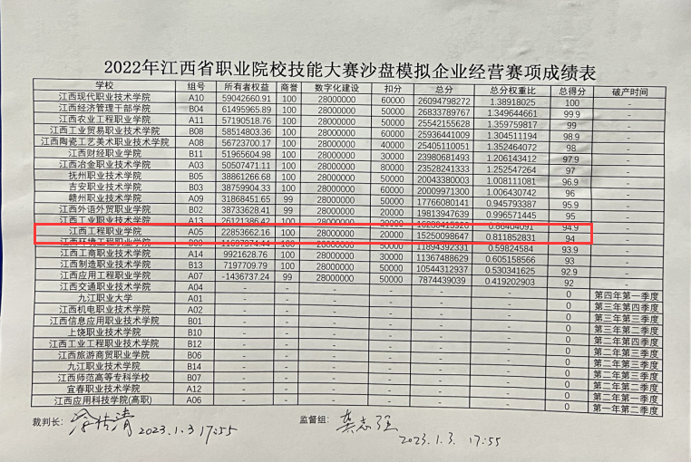 202313日,由江西省教育厅主办的2022年江西省职业院校技能大赛(高职组)“沙盘模拟企业经营”赛项在江西财经职业学院圆满落幕。由我院经管学院李小燕、姚洁老师指导,20会计1班马勤秀、20会计4班马一群、张志凤、陈慧琴四位同学组成的参赛团队,在该赛项中荣获三等奖的佳绩。