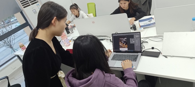 朱海玲同学曾凭借出色的美工和视觉设计技能获得过全国职业院校技能竞赛(高职电子商务赛项)的一等奖,且目前一直在企业项目中负责美工板块,对于毛钧同学的困扰,朱海玲很快找到她进行专项对接与帮扶,首先,帮助其重新熟悉PS各项工具的使用技巧;其次,对其进行电商视觉设计各项模块的制作内容和要点进行梳理;最后,结合自己负责的美工项目,让毛钧加入其中,辅助其进行设计。在这个过程中,毛钧同学快速成长,很快便能独立完成主图、详情页等版块的基本设计。