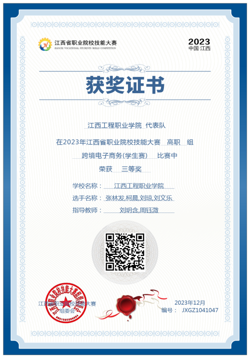 2023年12月1-2日,2023年江西省职业院校技能大赛(高职组)跨境电子商务赛项在江西省共青城市共青科技职业学院举办。全省共计28所高校112名选手经过激烈角逐,由我院教师刘玥含、周钰溦带队指导的2022级电子商务张林发、2022级电子商务柯晨、2022级网络营销与直播刘文乐、2022级网络营销与直播刘琼组成的代表队,荣获全省三等奖的好成绩,实现了我院在该赛项的新突破。