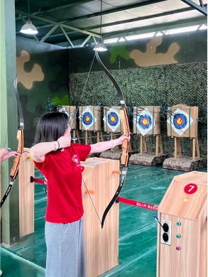 “真人CS体验”活动环节,大家来到了真人CS区,开启红色尖兵之旅。在野外,躲藏、瞄准、射击……模拟战时烽火时的状态,点燃了大家的青春激情。