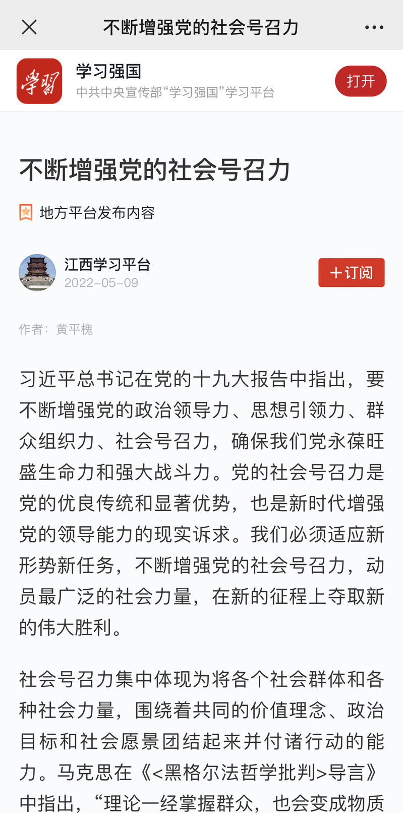 5月9日,我校党委副书记、校长黄平槐所著文章《不断增强党的社会号召力》在《江西日报》发表。文章指出,新的征程上,我们要从百年党史中汲取提升党的社会号召力的智慧和力量,不断增强党对社会各方力量的引领力、影响力、凝聚力和动员力。学习强国、大江网等媒体全文转载。