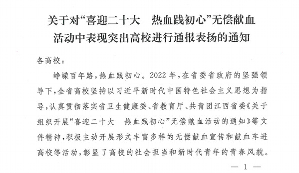 近日,江西省卫生健康委员会、江西省教育厅、共青团江西省委联合印发的《关于对“喜迎二十大 热血践初心”无偿献血活动中表现突出高校进行表扬的通知》,学校获通报表扬。