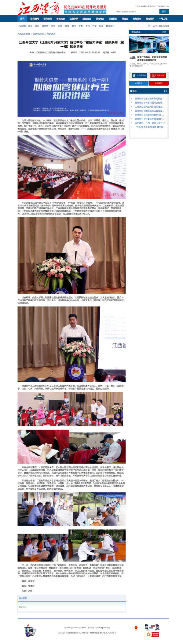 为深入贯彻落实党的二十大精神,落实积极应对人口老龄化国家战略,践行“学思想、强党性、重实践、建新功”的总要求,切实为民办好事办实事,满足老年朋友多样化学习需求,提升老年群体生活品质、生命质量和幸福指数,4月19日下午,必赢76net线路官网(江西老年开放大学)联合江西省教育厅、江西省科学技术协会、南昌大学第二附属医院、江西省医疗健康投资有限公司,共同开展“银龄大讲堂”——《心脑血管健康养生知识》健康系列(第一期)讲座。