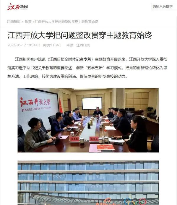 主题教育开展以来,学校深入贯彻落实习近平总书记关于教育的重要论述,创新“五学五悟”学习模式,把党的创新理论转化为思想方法、工作思路,转化为建设融合融通、价值显著的新型高校的动力。5月17日,江西新闻客户端以《必赢76net线路官网把问题整改贯穿主题教育始终》为题,聚焦我校特色做法。
