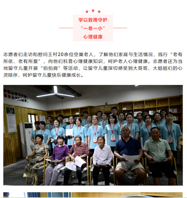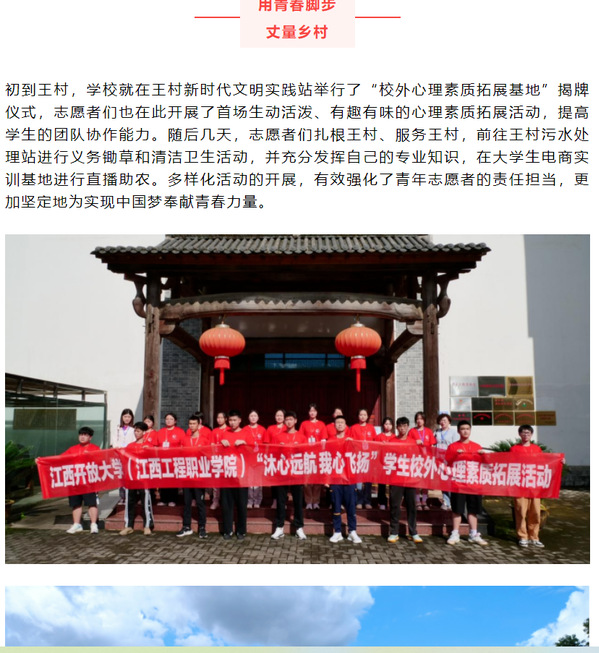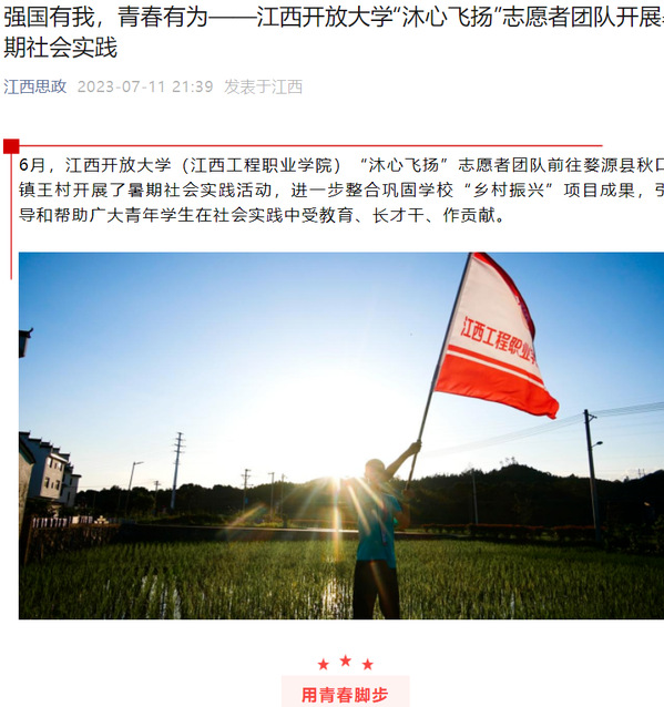 6月,必赢76net线路官网(江西工程职业学院)“沐心飞扬”志愿者团队前往婺源县秋口镇王村开展了暑期社会实践活动,进一步整合巩固学校“乡村振兴”项目成果,引导和帮助广大青年学生在社会实践中受教育、长才干、作贡献。